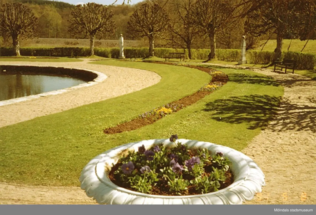 En blomkruka på grusvägen och en blomsterrabatt vid dammen. I bakgrunden ses statyer. Gunnebo Slottspark, maj 1991.
