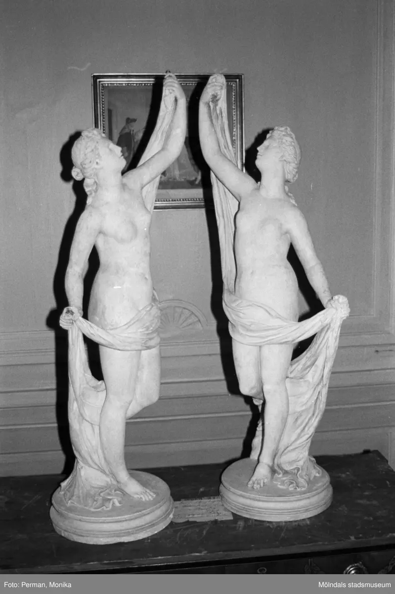 Antikvarisk storstädning på Gunnebo slott 1992. Två kvinnoskulpturer på en byrå.