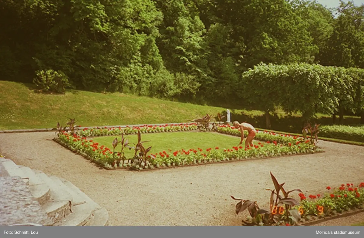 En man som ansar blommor i en rabatt på Gunnebo slotts baksida.