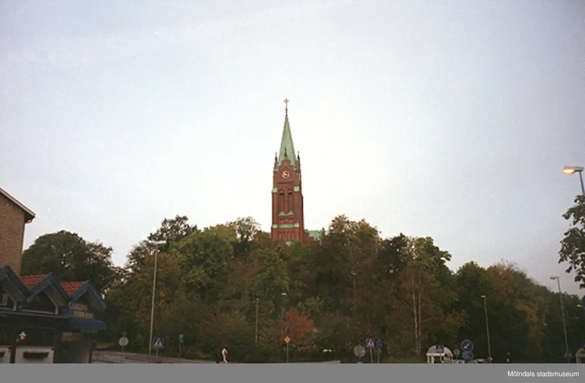 Fässbergs kyrka. Restaurang/café/konditori Sahlins terrass på Storgatan skymtar till vänster. Mölndalsbro i dag - ett skolpedagogiskt dokumentationsprojekt på Mölndals museum under oktober 1996. 1996_1338-1356 är gjorda av högstadieelever från Åbyskolan 8A, grupp 6. Se även 1996_0913-0940, gruppbilder på klasserna 1996_1382-1405 och bilder från den färdiga utställningen 1996_1358-1381.