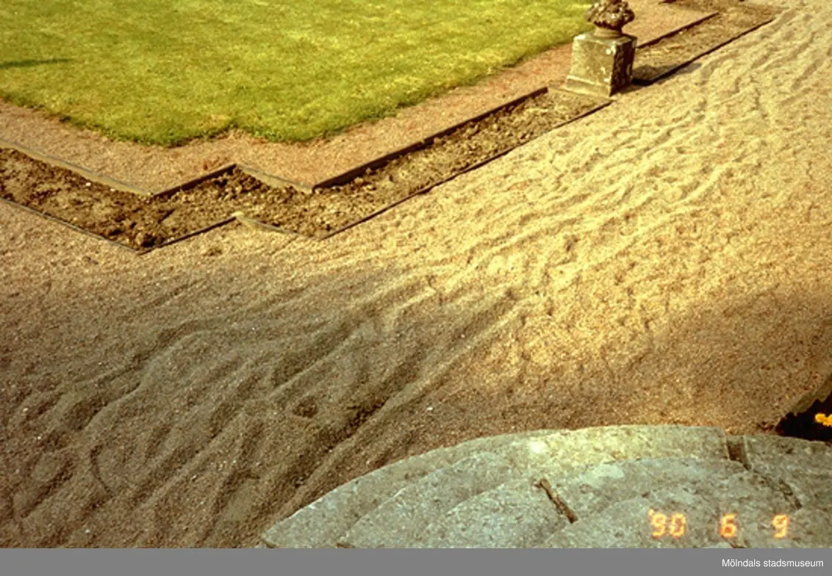 En grusgång vid gräsmatta. Gunnebo slottsträdgård, juni 1990.