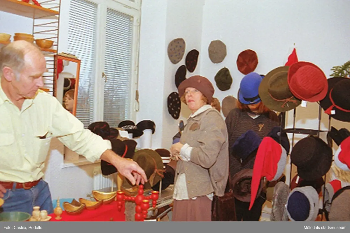 Hattprovning. Julmarknad på Mölndals museum 1994-12-04.
