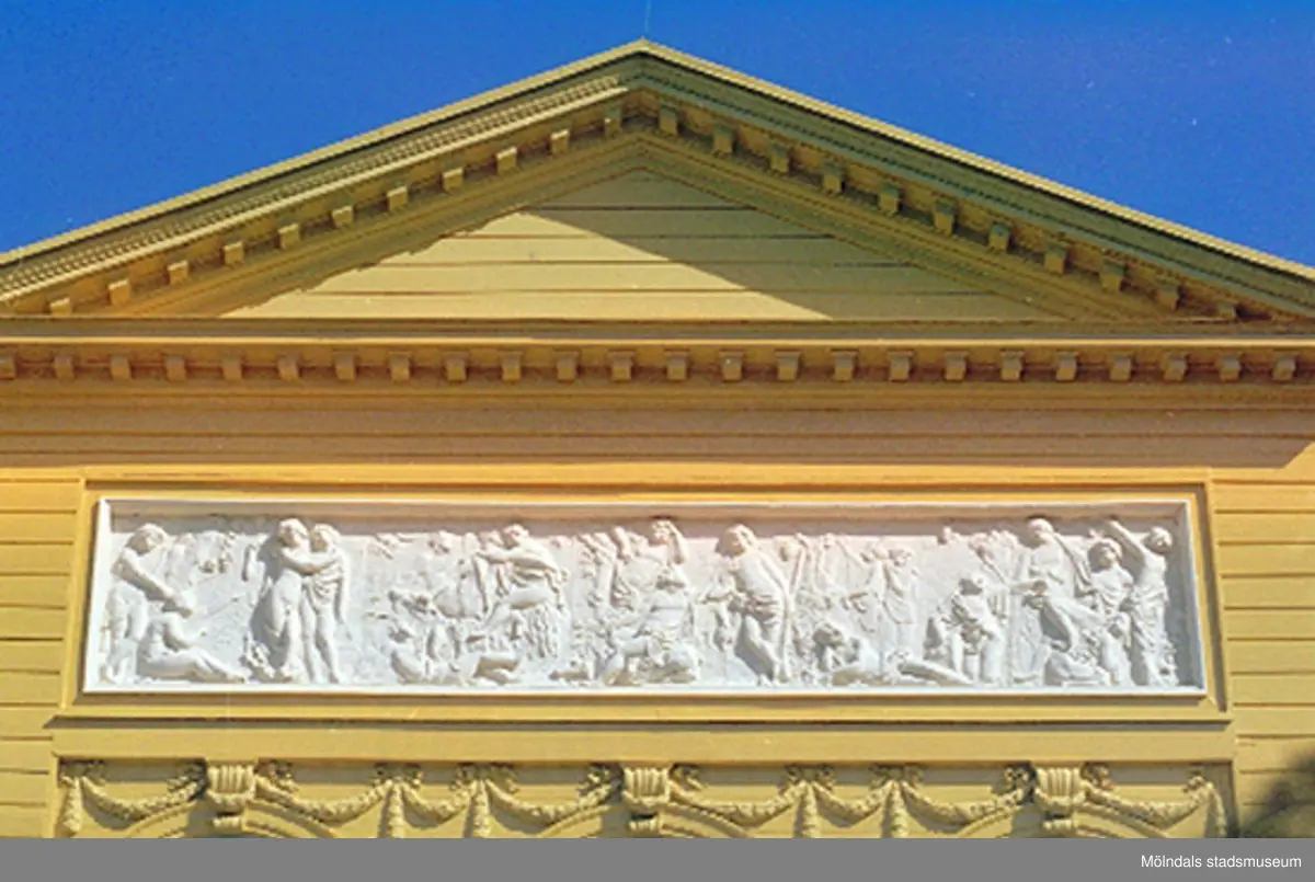 Frisen över balkongen på södra sidan "Lantmannagöromål och nöjen". Klassicerande blyrelief på södra fasaden av Gioacchino Frulli (1766-1801). Dokumentation av sönderslagna skulpturer Bacchus och Flora, Gunnebo slott juni 1993.