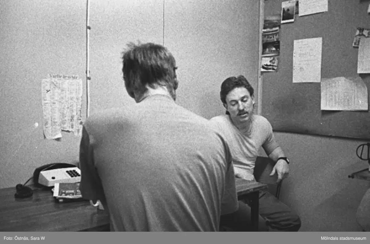 Titel: Kaffepaus på pappersfabriken, 1980-tal. Bilden ingår i serie från produktion och interiör på pappersindustrin Papyrus.