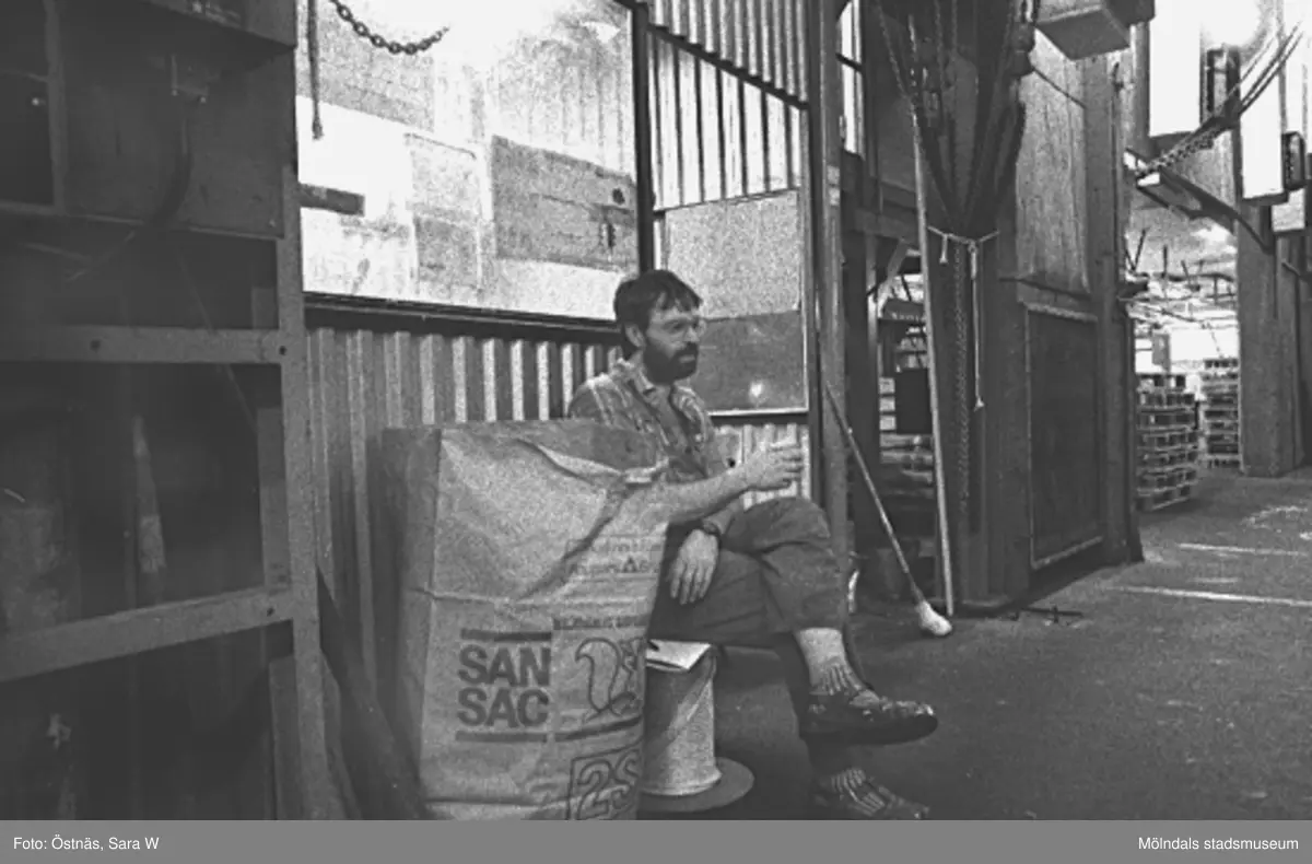 Maskinförare Ensio Tiitinen tar kaffepaus ute i fabriken KM 2, 1980-tal. Bilden ingår i serie från produktion och interiör på pappersindustrin Papyrus.