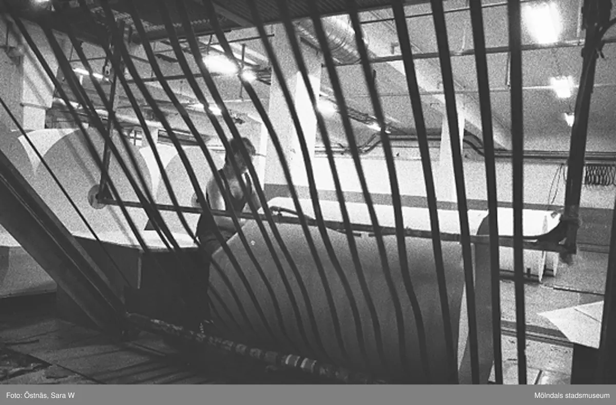 Titel: En man i arbete med en pappersbal, 1980-tal. Bilden ingår i serie från produktion och interiör på pappersindustrin Papyrus.