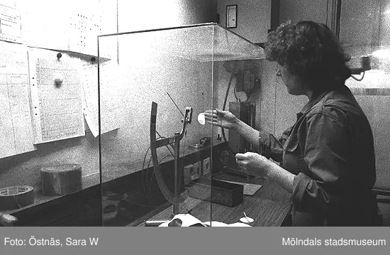 En kvinna i pappersfabriken mäter vikten på de olika skikten på den färdigtillverkade kartongen, 1980-tal. Bilden ingår i en serie från produktion och interiör på pappersindustrin Papyrus.