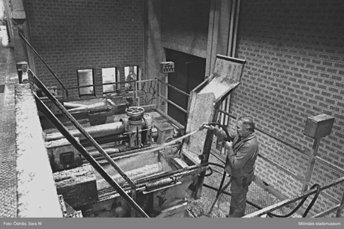 Esko Kiviniemi spolar rent. Bilden ingår i serie från produktion och interiör på pappers-industrin Papyrus, 1980-tal.