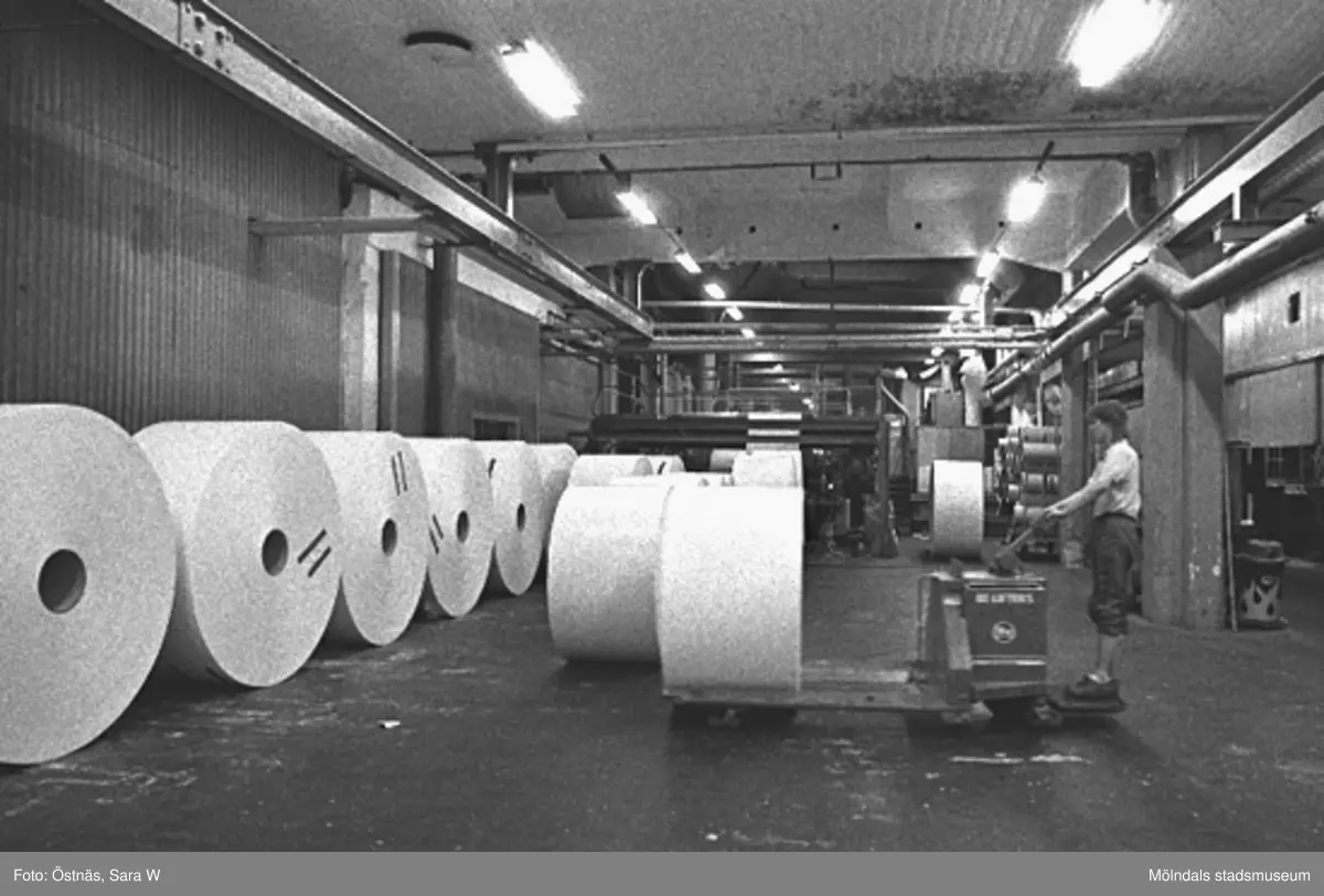 Bilden ingår i serie från produktion och interiör på pappersindustrin Papyrus, 1980-tal.