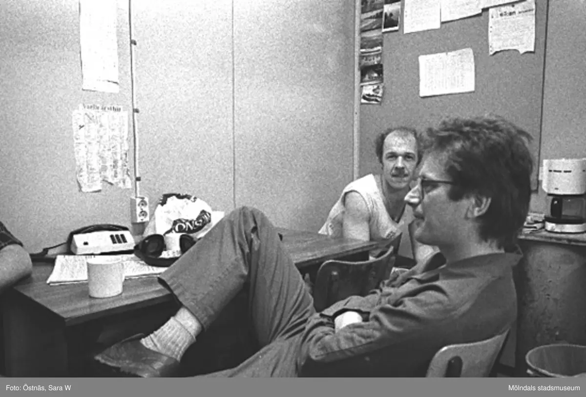 Kaffepaus där Jan Callesen ses till vänster. Bilden ingår i serie från produktion och interiör på pappersindustrin Papyrus, 1980-tal.