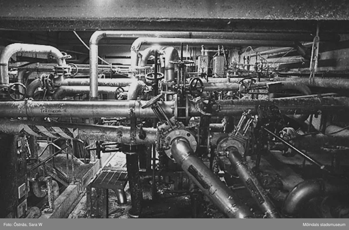 Interiördetalj från pappersfabriken; rör, kablar och ventiler, 1980-tal.