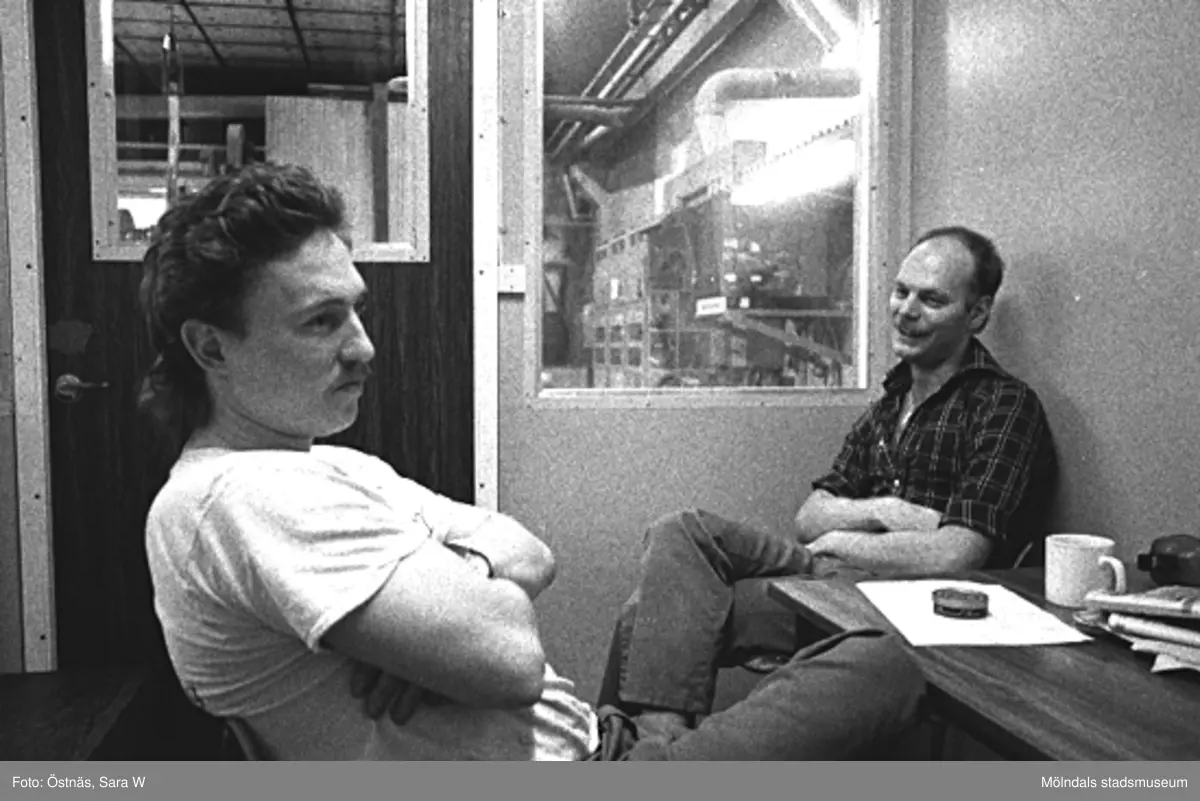 Roger Techel och Denny Anderson har kaffepaus vid pappersfabriken, 1980-tal. Bilden ingår i serie från produktion och interiör på pappersindustrin Papyrus.