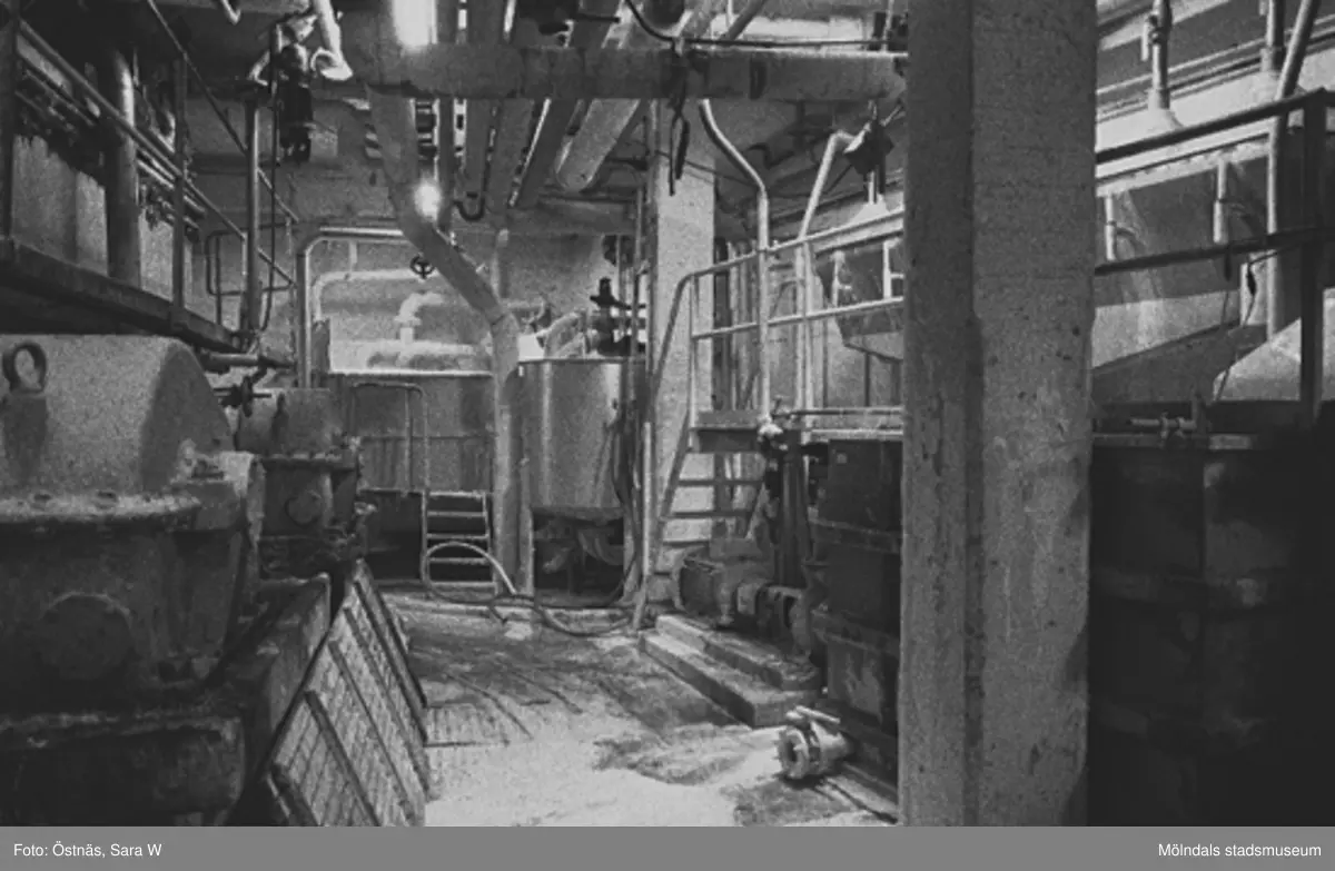 Interiördetalj från pappersfabriken; rör och trappor, 1980-tal.