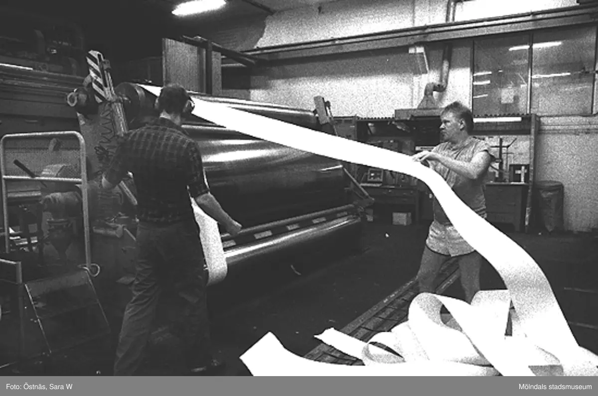 Två män vid en maskin för papperstillverkning, 1980-tal. Mannen som drar i papperet är Kent-Erik Pettersson.