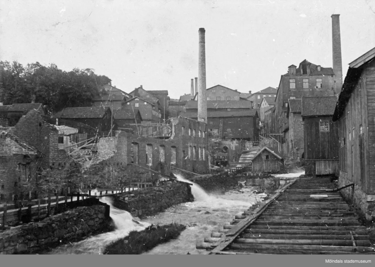 Nedre delen av forsen (Mölndalsfallen) uppströms Forsebron, sommaren 1894. Till höger ses kvarnrännan.