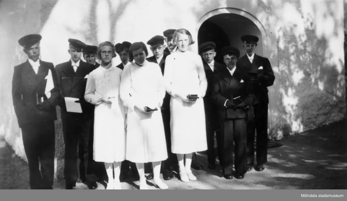 Konfirmander från Stretered skolhem, fotograferade utanför Kållereds kyrka 1942.