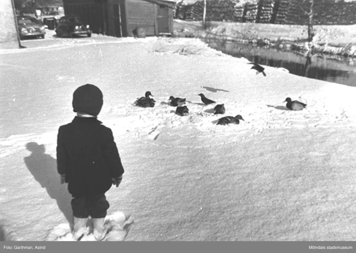 Jerry Garthman står och tittar på änder vid Mölndalsån. På andra sidan ligger Papyrus vedupplag. Till vänster står en Borgward Isabella och en Saab 93:a. Slutet av 1950-talet.
