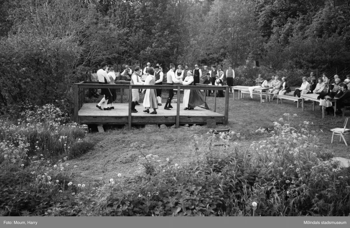Gammeldans i Långåker, Kållered, år 1983. Kvarnbyns folkdanslag dansar till musik framförd av Kållereds spelmanslag.