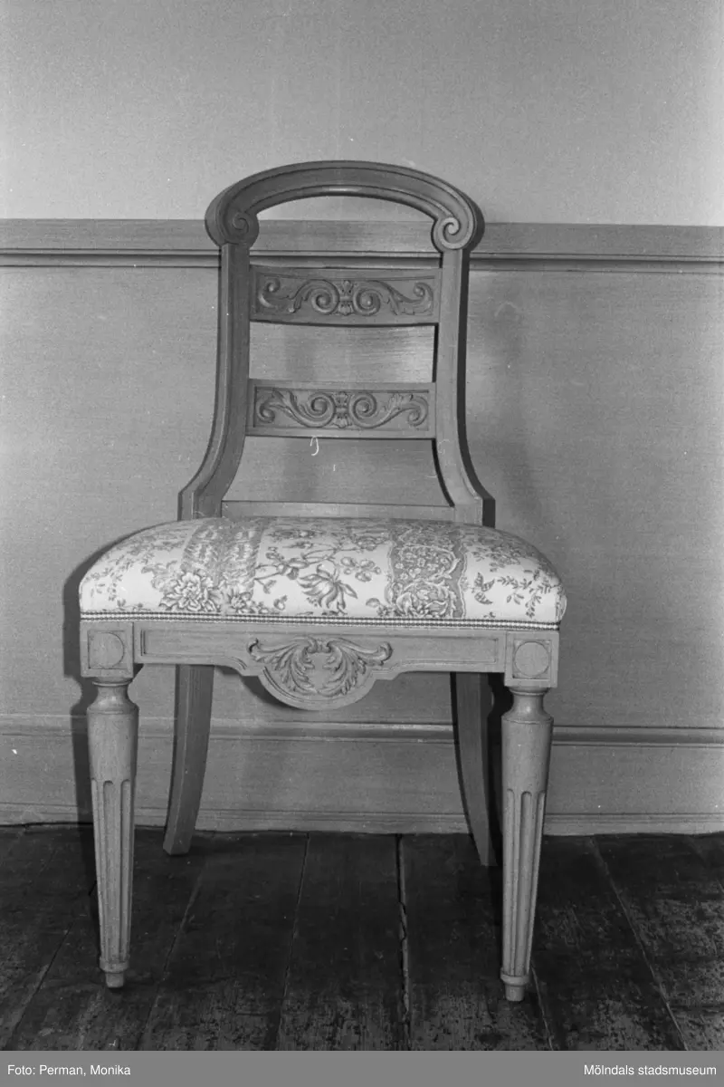 Antikvarisk storstädning på Gunnebo slott 1992. En stol som står vid en väggpanel.