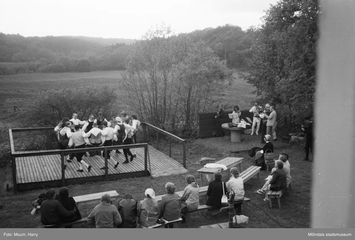 Gammeldans i Långåker, Kållered, år 1983. "Kvarnby folkdanslag och Kållereds Spelmanslag värmer upp publiken en kall sommarkväll på Långåker."