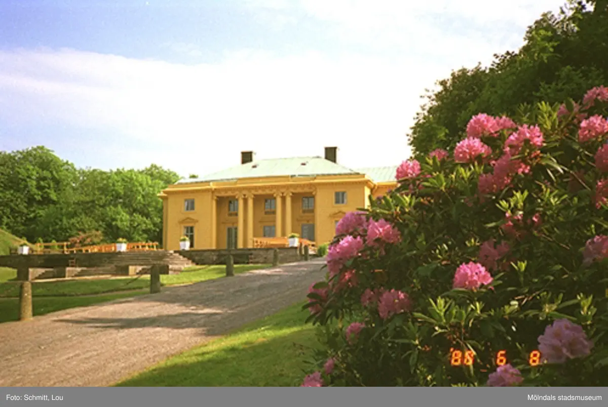 Till höger ser man en fullt utslagen rosa rhododendronbuske. I bakgrundens mitt ligger det gulfärgade Gunnebo slott med grusväg och gräsmatta framför.