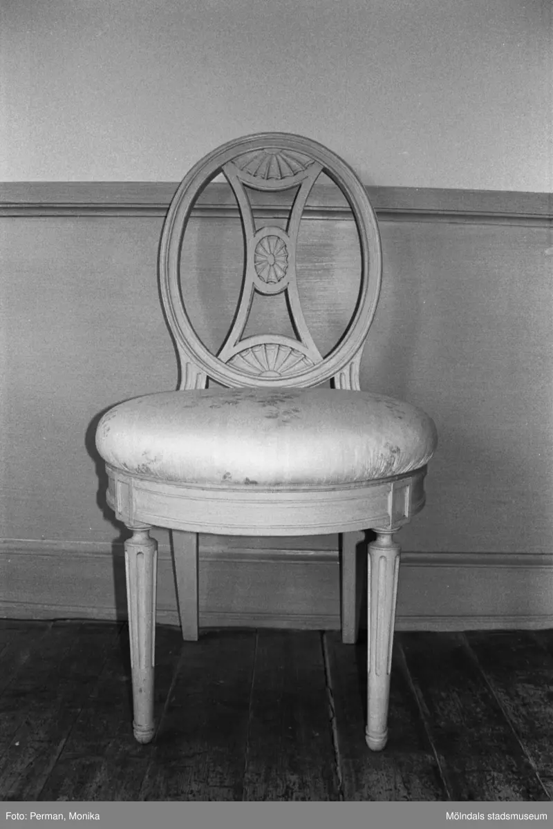Antikvarisk storstädning på Gunnebo slott 1992. En stol som står vid en väggpanel.