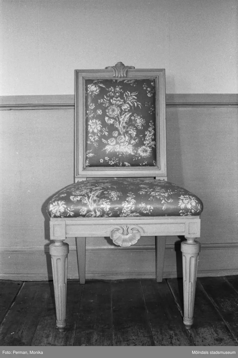Antikvarisk storstädning på Gunnebo slott 1992. En stol som står vid en väggpanel.