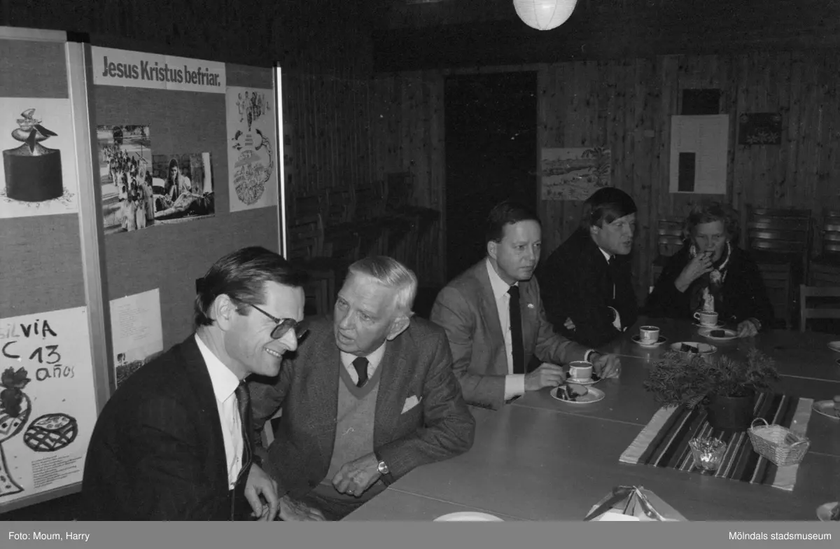 Förre arbetsmarknadsministern Ingemar Eliasson på besök i Kållereds Missionskyrkas fritidsgård, år 1983. "Förre arbetsmarknadsministern Ingemar Eliasson i glatt samspråk med 81-årige Paul Andersson. Vidare ses Gunnar Trenning och Kent Skårvik."