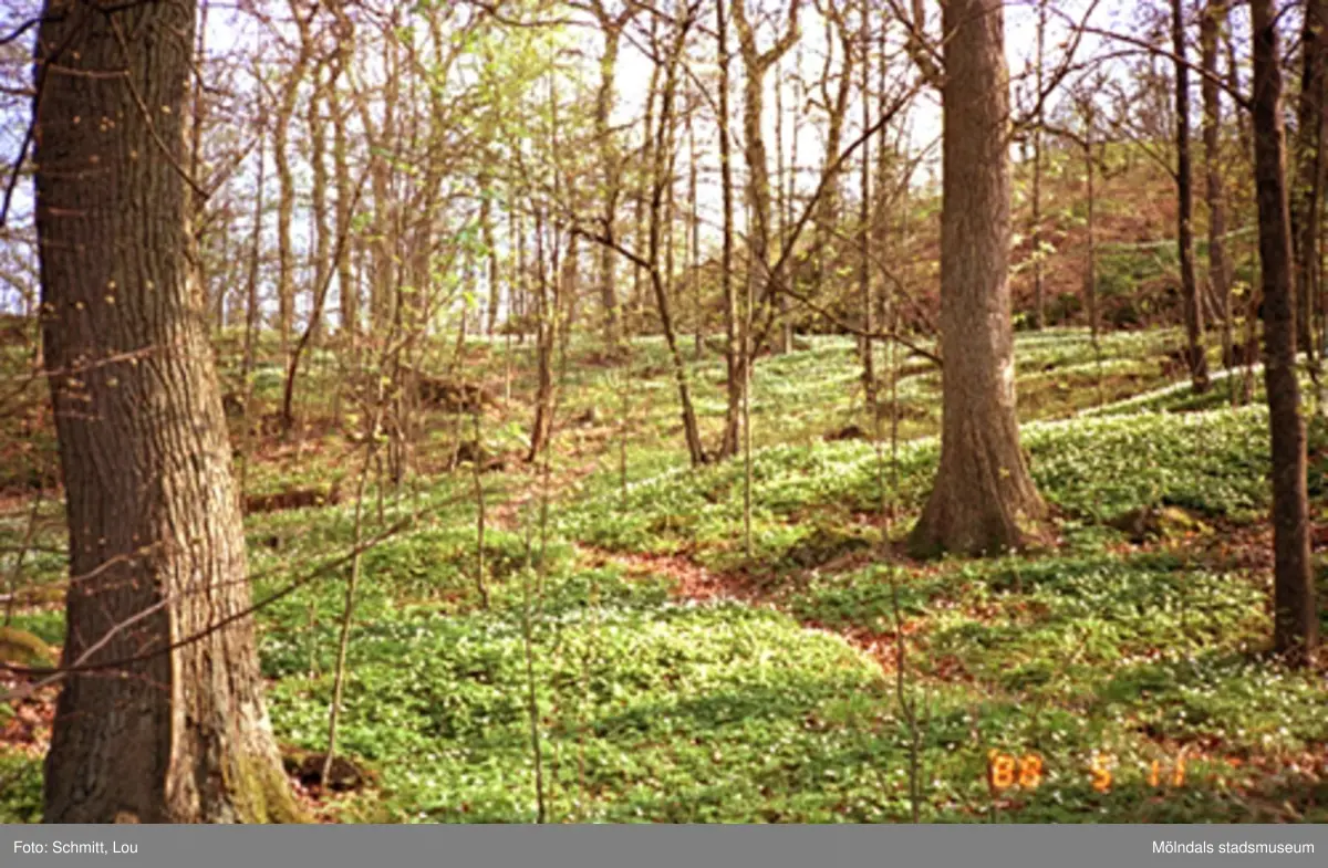 Vild flora som växer på Gunnebo slotts marker. Här ser man vitsippor som blommar mellan stenar och träd.