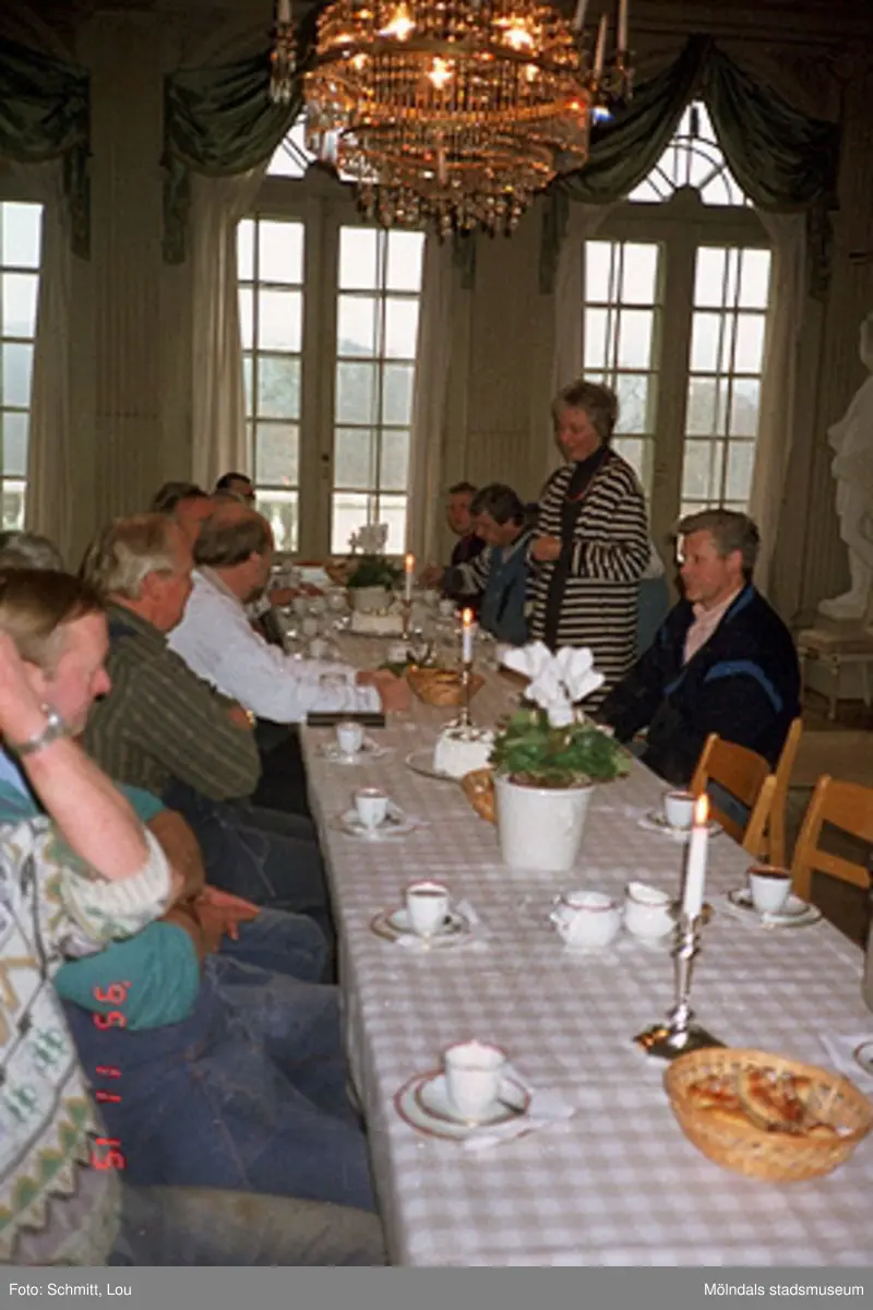 Avtackning av Johan och Anna-Greta Ryhag. De hade deltagit som frivilligarbetare i utgrävningarna på Gunnebo slott under ledning av arkeolog Lou Schmitt. Mannen till höger i blått är Sven-Åke Svensson (tekniker på Gunnebo slott samt Mölndals museum).
