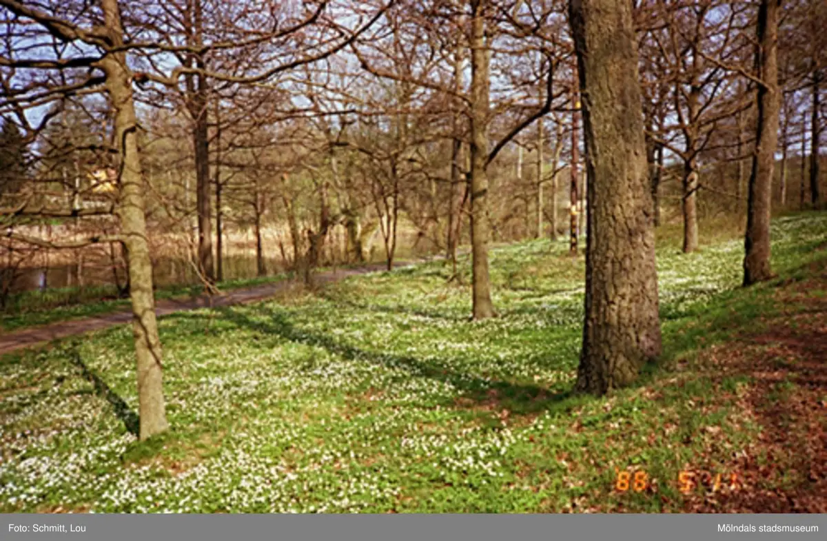 Vild flora som växer på Gunnebo slotts marker. Här ser man vitsippor som blommar mellan stenar och träd.