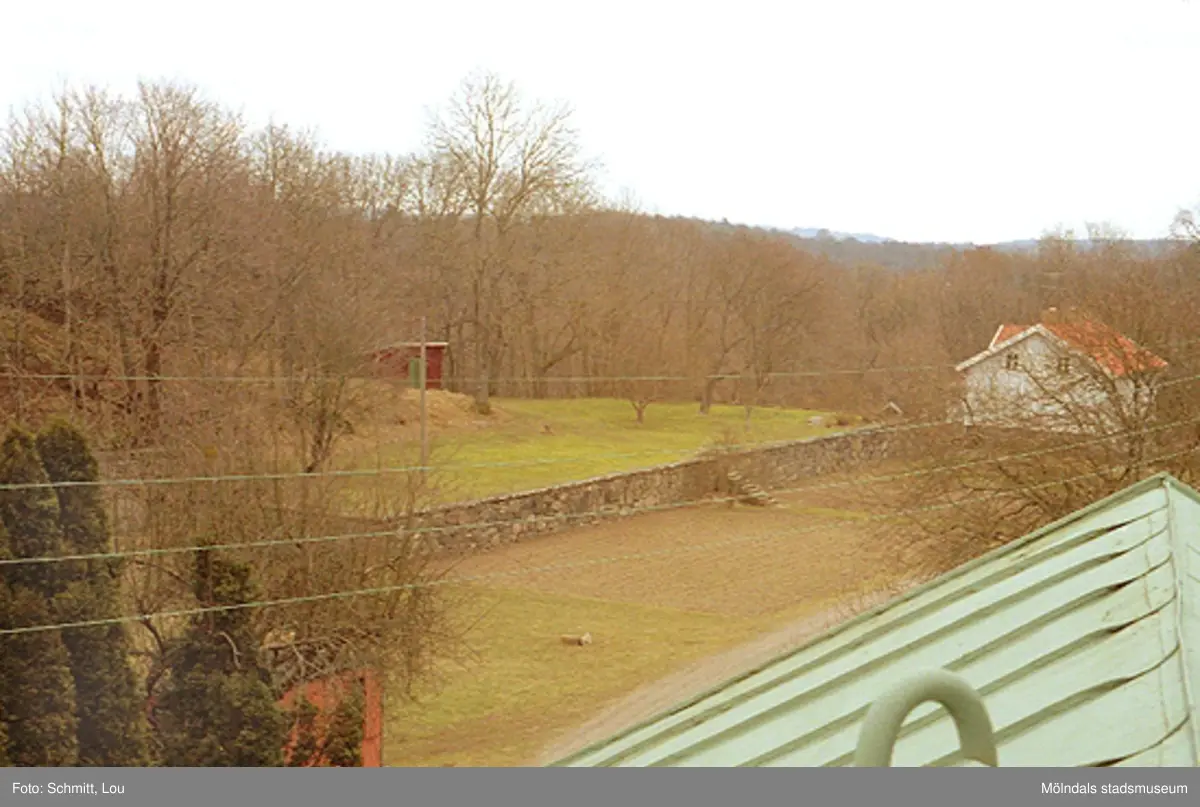 Gunnebo slottspark. I fronten ser man ett grönfärgat tak och längre bort en mur samt ett bostadshus längst till vänster.