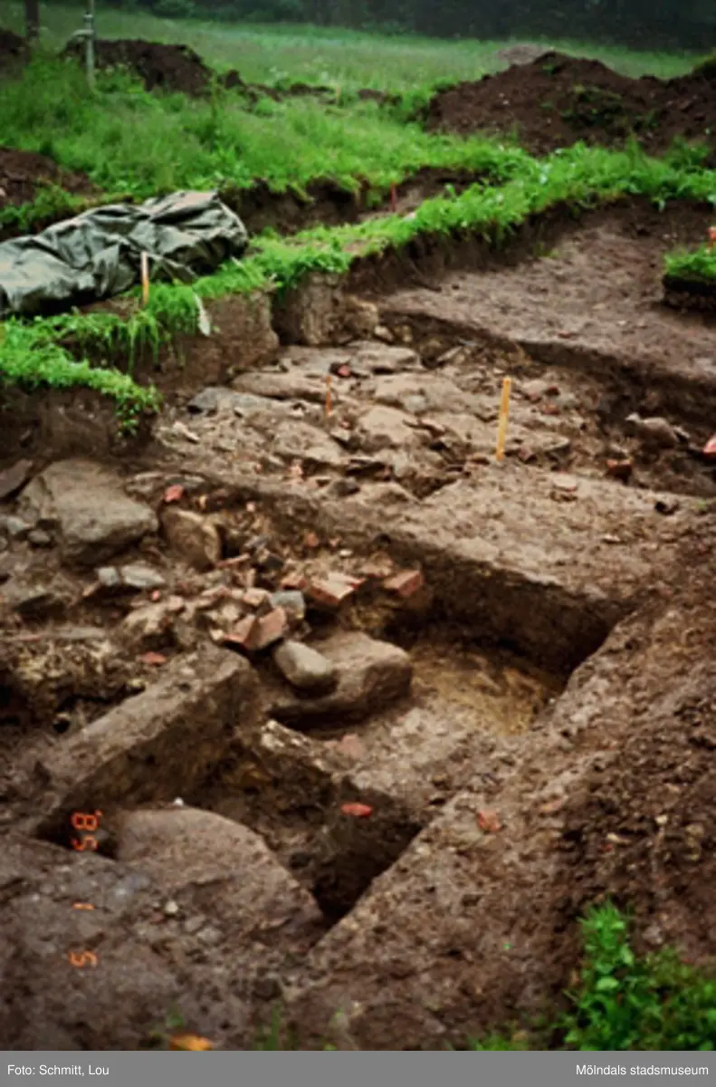 Vy på ett utgrävningsschakt i Gunnebo slotts köksträdgård "A", augusti 1995.