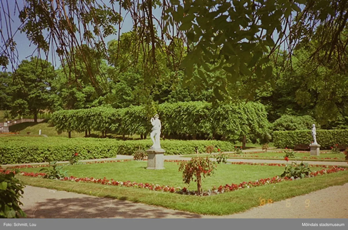 Gunnebo slotts baksida. Man ser två gräsmattor med varsin skulptur i mitten, kantad av blomrabatter. I bakgrunden ser man häckar och träd.