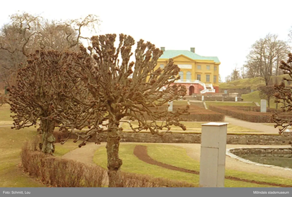 En del av Gunnebo slottspark med dammen till höger och slottet som syns i bakgrunden.