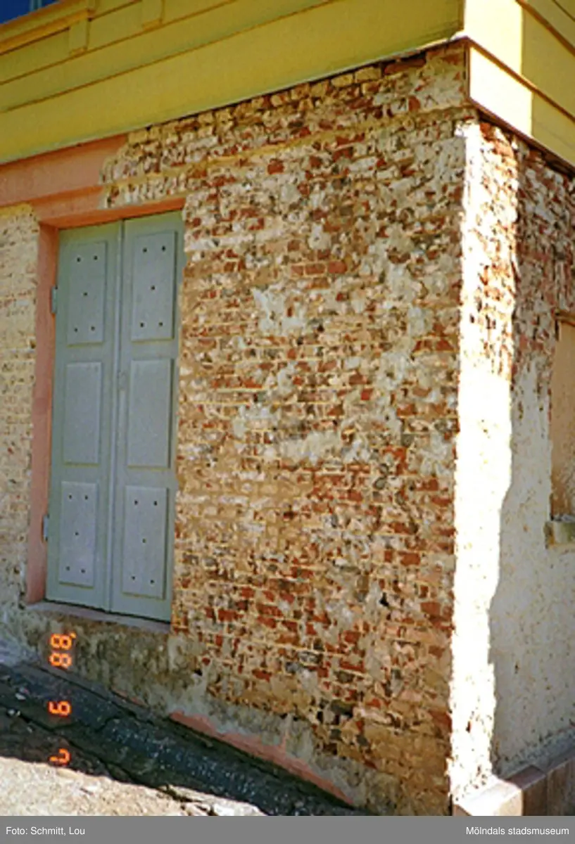 Exteriörbild av källarfasad och igensatt fönster till Gunnebo slott, 1988.