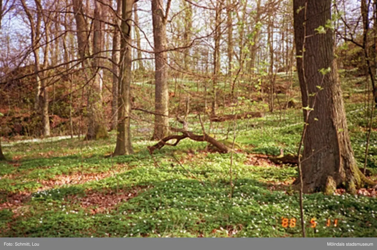 Vild flora som växer på Gunnebo slotts marker. Här ser man vitsippor som blommar mellan stenar och träd.