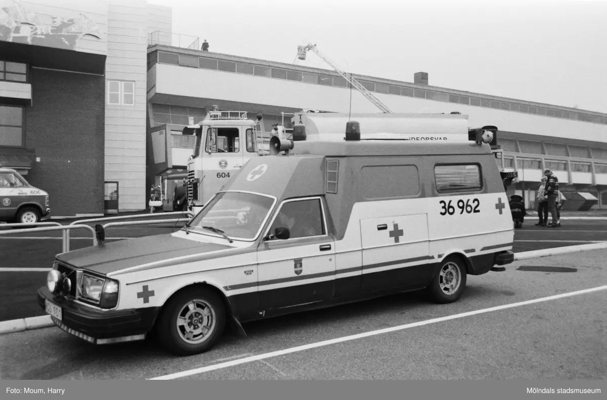 Utryckning med brandbil och ambulans till Åby travbana i Mölndal, år 1983.