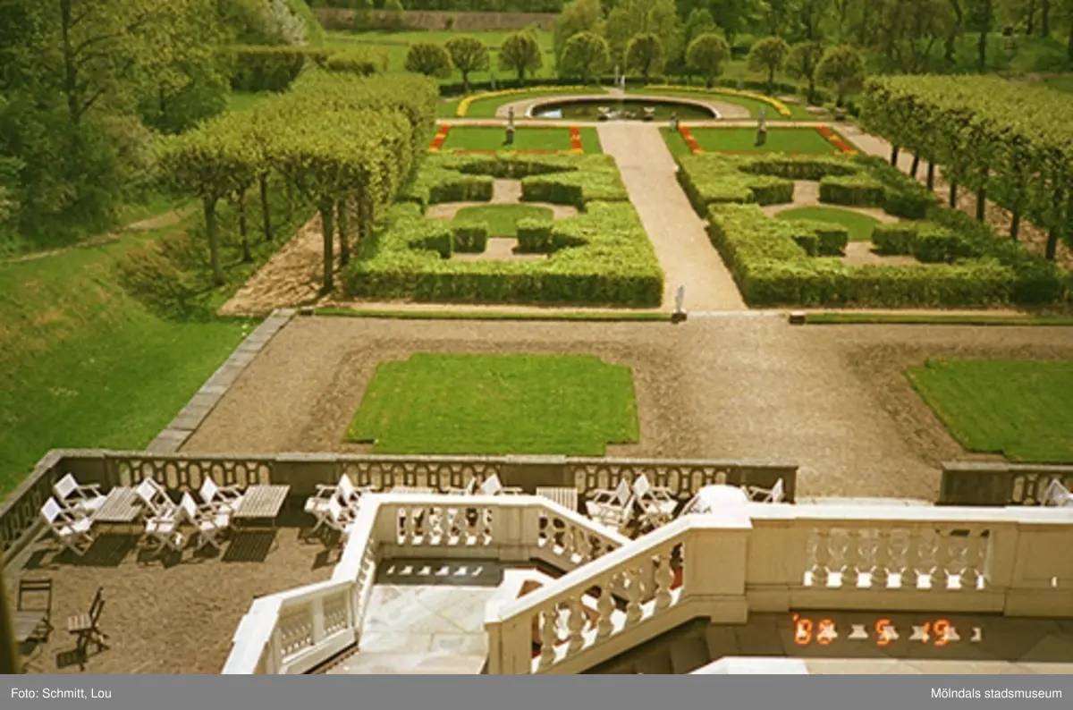 En översiktsbild av en del av Gunnebo slottspark med dammen i bakgrunden, sett från slottets trappsats.