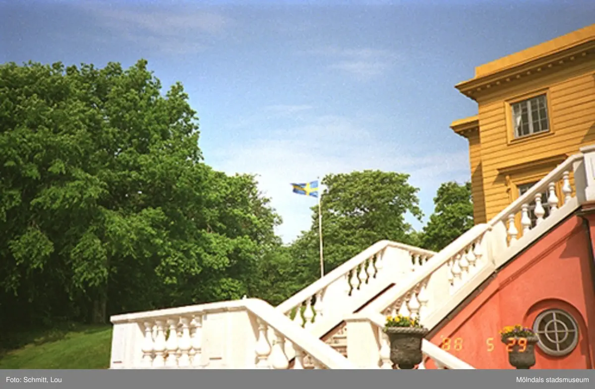 En rödokra-målad trappa med vitt räcke av sten som leder upp till Gunnebo slott. Man skymtar en liten del av slottet strax ovanför trappan. I bakgrunden ser man en flaggstång med Svenska flaggan hissad.