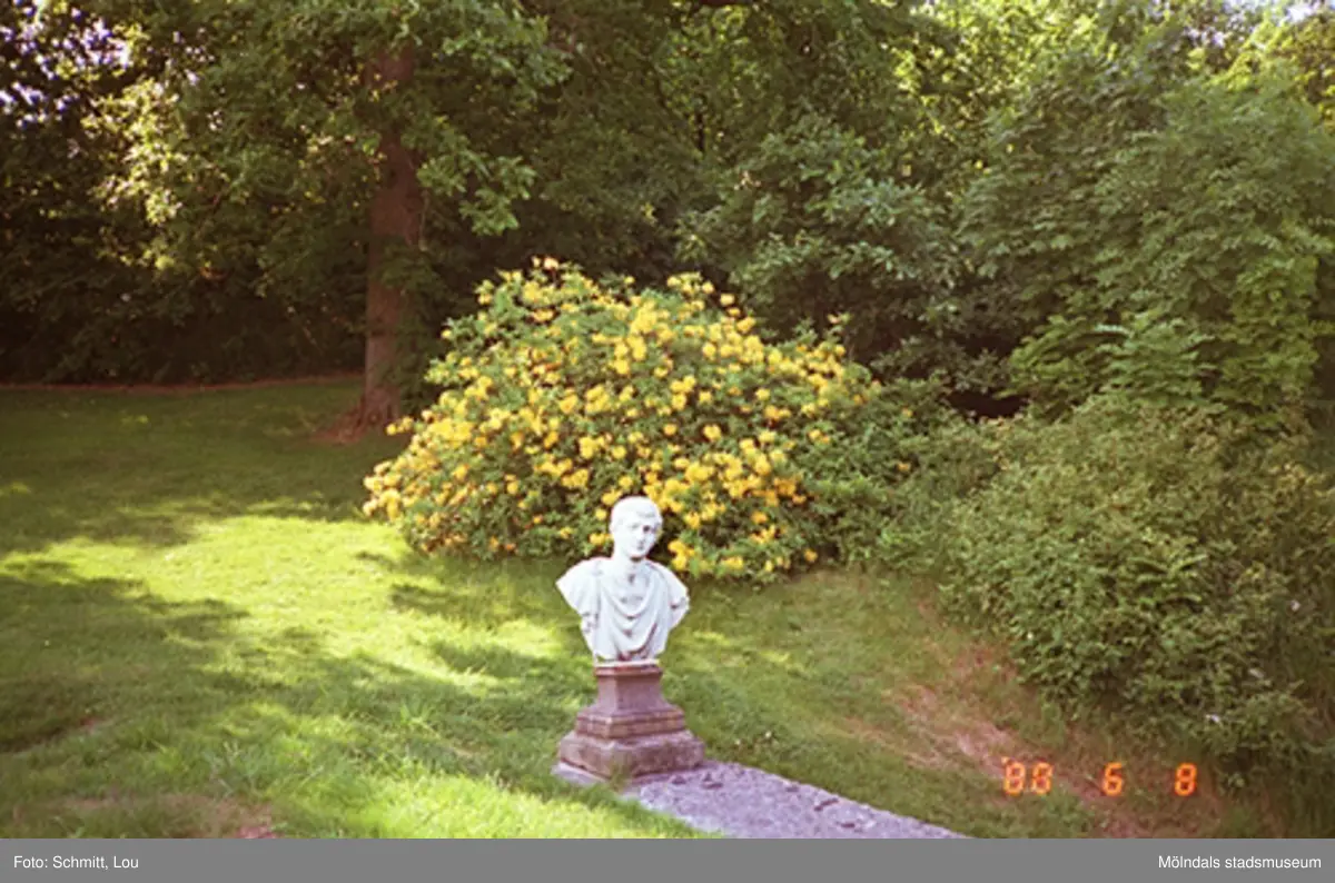 En byst uppställd på några stenar, på gräsmattan utanför Gunnebo slott.
