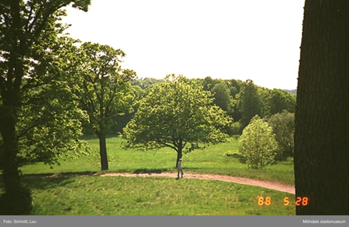 Man ser en vy av gräsmattor, flera träd samt en grusstig i Gunnebo slottspark.
