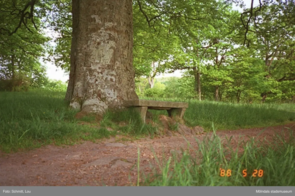 En stenbänk som står placerad bredvid ett stort träd. Framför detta löper en grusstig. Gunnebo slott, 1988.