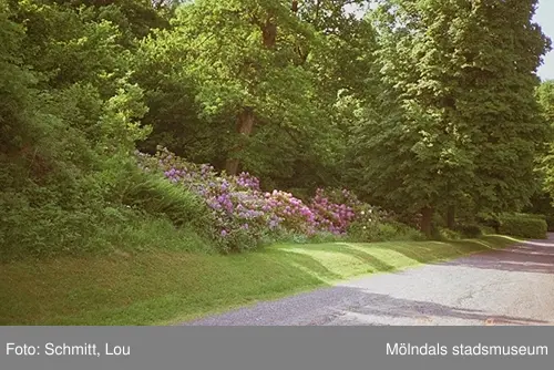 En sluttning med lila rhododendronbuskar i full blom. Dessa står omgärdade av träd. Framför växterna löper en grusväg.