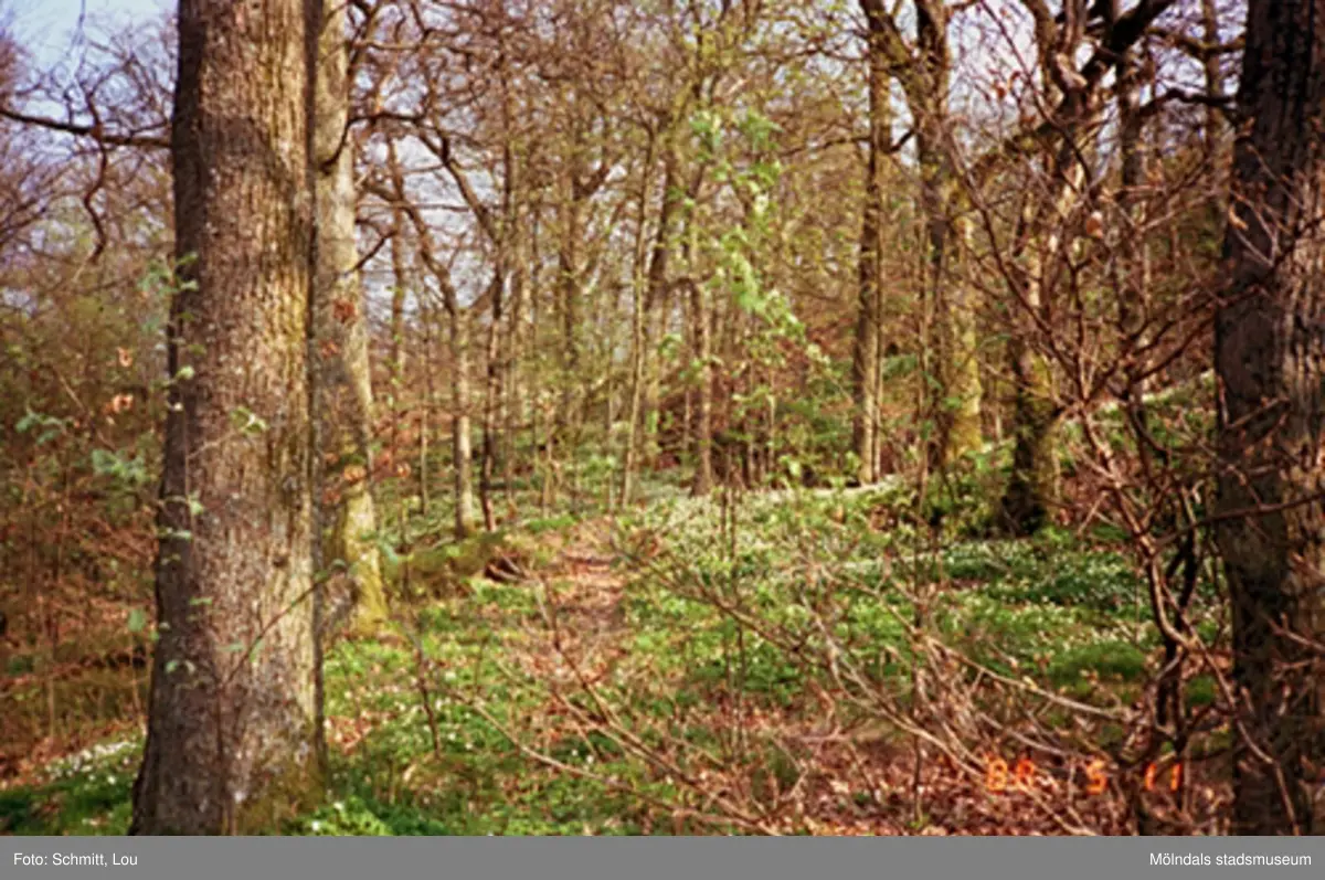 Vild flora som växer på Gunnebo slotts marker. Här ser man vitsippor som blommar mellan stenar och träd.