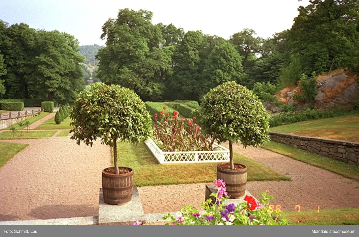 En del av parken vid Gunnebo slott. Man ser växtlighet och rabatter samt träd i bakgrunden.