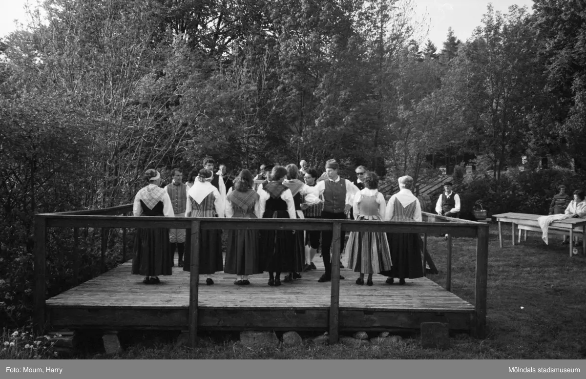 Gammeldans i Långåker, Kållered, år 1983. Kvarnbyns folkdanslag dansar till musik framförd av Kållereds spelmanslag.