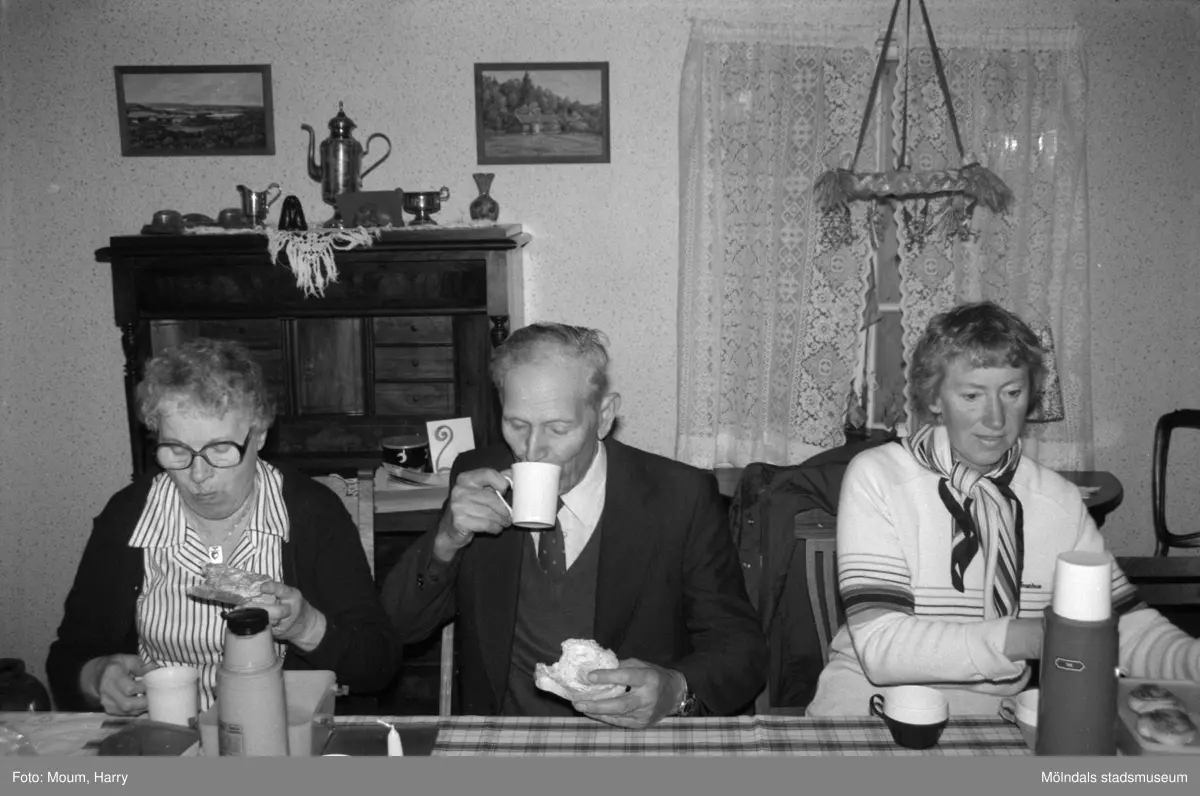 Gökotta på hembygdsgården i Långåker, Kållered, år 1985. Från vänster: Ingrid Carlsson, Gustaf Carlsson och Maj-Britt Andersson.