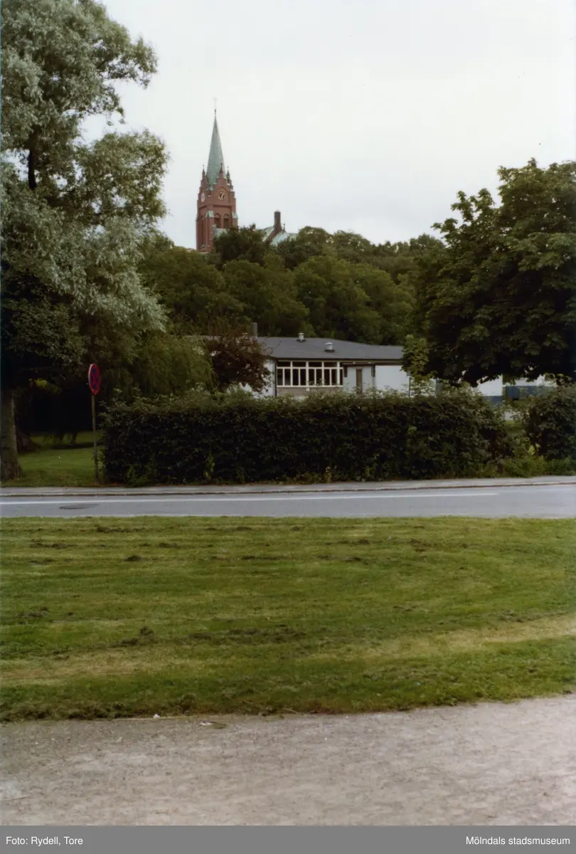 Vy från Toltorpsgatan mot Fässbergs kyrka i Mölndal på 1970-talet. I förgrunden skymtas även byggnad tillhörande yrkesskolan.