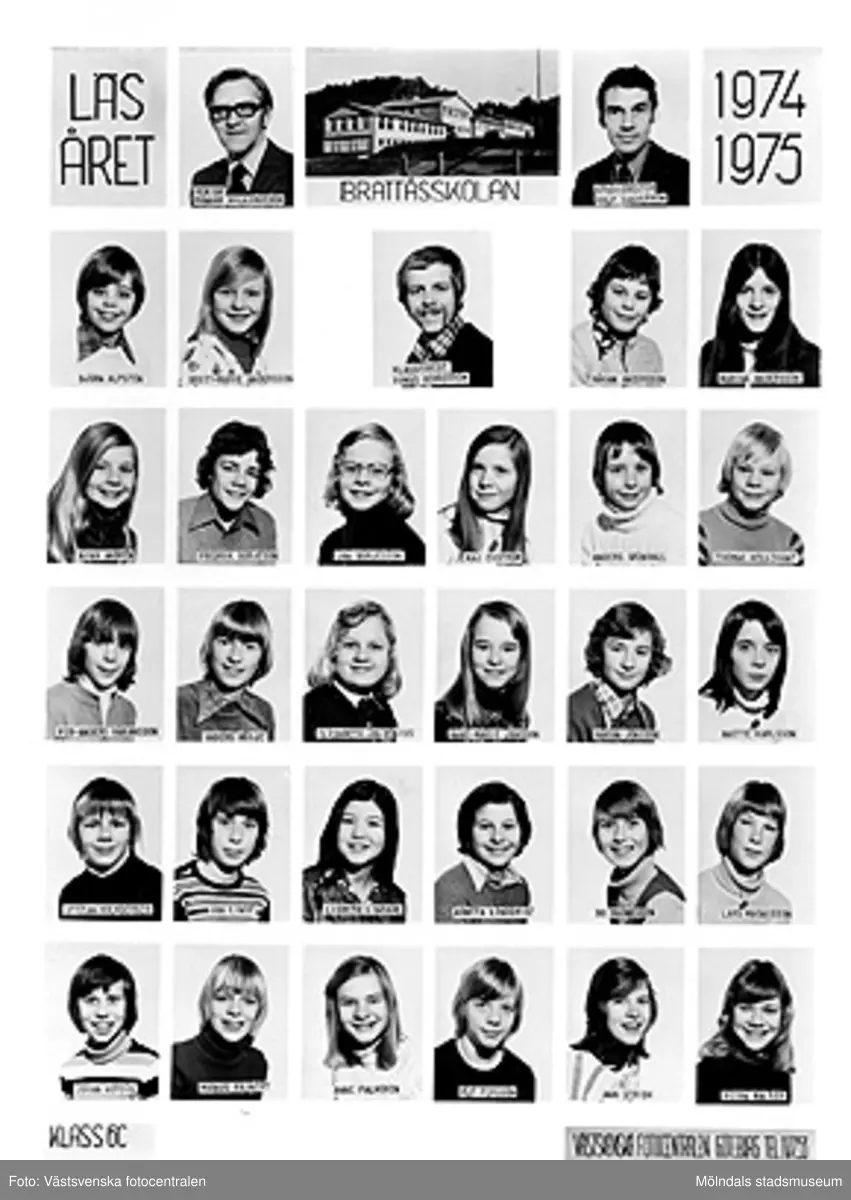 En bildkarta med skolfoton på klass 6C i Brattåsskolan, läsåret 1974/1975. Bildkartan är uppklistrad på ett fotoark i en pärm (MM23916) från Brattås rektorsområde, tillsammans med andra skolfoton MMF2004_1484-1522.